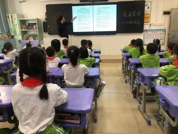 當(dāng)日上午9:00,各班利用教室多媒體設(shè)備在教育部全國(guó)青少年普法網(wǎng)收看了憲法晨讀網(wǎng)絡(luò)直播。全體師生通過直播觀看了現(xiàn)場(chǎng)舉行的升旗儀式、憲法晨讀、北京主會(huì)場(chǎng)領(lǐng)唱《憲法伴我們成長(zhǎng)》歌曲、優(yōu)秀學(xué)生現(xiàn)場(chǎng)展演、最高檢察院副檢察長(zhǎng)講法治課等活動(dòng),深刻領(lǐng)會(huì)了憲法的含義。隨后,各班班主任帶領(lǐng)學(xué)生逐字逐句地朗讀《憲法晨讀》內(nèi)容。通過二十分鐘的朗讀,全校師生對(duì)憲法有了初步的認(rèn)識(shí),對(duì)憲法中的基本法律知識(shí)有了初步的了解。