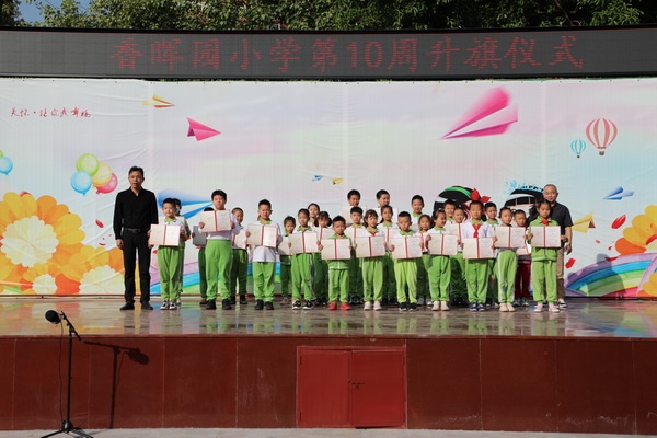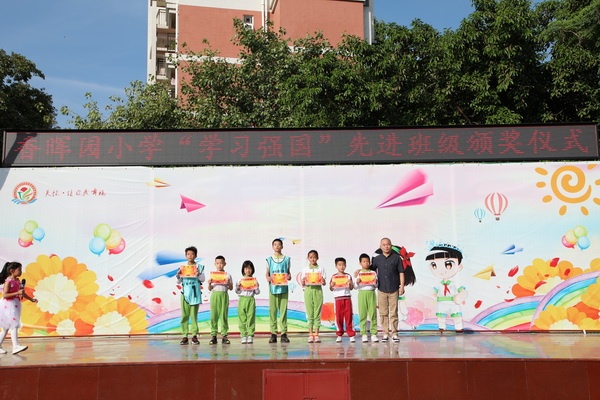 接著是“榮譽(yù)時(shí)刻”環(huán)節(jié)。葉建林老師帶領(lǐng)竹笛隊(duì)演奏作品《揚(yáng)鞭催馬運(yùn)糧忙》榮獲全球音樂教育聯(lián)盟廣東賽區(qū)“第一屆青少年藝術(shù)展演”金獎(jiǎng),作品《新編進(jìn)行曲》榮獲銀獎(jiǎng)。同時(shí),作品《揚(yáng)鞭催馬運(yùn)糧忙》還在晉級(jí)賽中榮獲二等獎(jiǎng)。歐陽祝棣校長(zhǎng)和劉裕副校長(zhǎng)為這兩個(gè)作品的參賽選手頒發(fā)了證書并與他們合影留念。儀式上還頒發(fā)了“學(xué)習(xí)強(qiáng)國(guó)”學(xué)習(xí)先進(jìn)獎(jiǎng)。