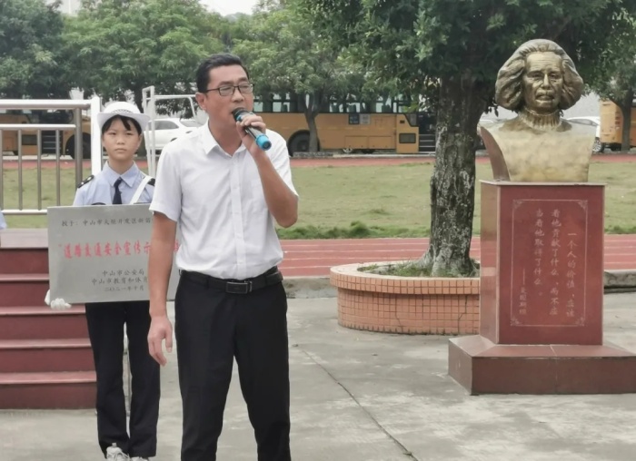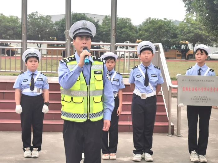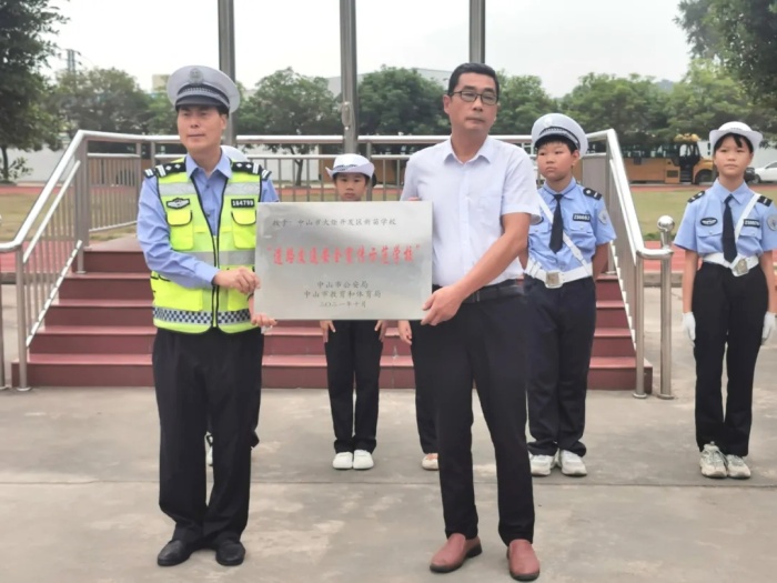 為提升學(xué)生的交通安全意識(shí),引導(dǎo)少年兒童樹立“知危險(xiǎn)會(huì)避險(xiǎn),安全文明出行”的正確理念。新苗學(xué)校與火炬開發(fā)區(qū)交警大隊(duì)聯(lián)合組建了“校園小交警”站,“小交警”成立后,參與了“夏季攻堅(jiān)”“頭盔風(fēng)暴”等交通安全宣傳活動(dòng),在短短的幾個(gè)月里成果顯著,得到了中山市公安局和中山市教體局的肯定,決定授予新苗學(xué)?!暗缆方煌ò踩麄魇痉秾W(xué)?!狈Q號(hào)。11月3日上午,新苗學(xué)?!暗缆方煌ò踩麄魇痉秾W(xué)校”授牌儀式在學(xué)校操場(chǎng)舉行。此次活動(dòng)由德育主任黃俊主持。