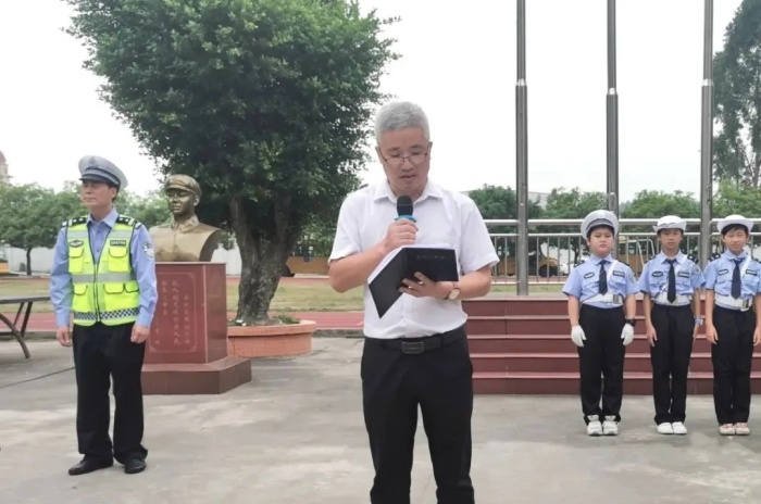 活動(dòng)伊始,德育主任黃俊對(duì)“小交警”組建幾個(gè)月來(lái)開展的活動(dòng)給予了充分的肯定,對(duì)學(xué)校被授予“道路交通安全宣傳示范學(xué)校”的稱號(hào)表示祝賀。接著,授牌儀式正式開始,火炬開發(fā)區(qū)交警大隊(duì)吳滿權(quán)警官為學(xué)校授牌。