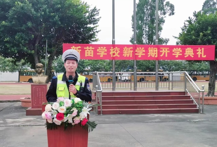 隨后,教師代表蔣瑩瑩老師勉勵(lì)同學(xué)們?cè)谛碌膶W(xué)期端正態(tài)度,養(yǎng)成好習(xí)慣,勤奮學(xué)習(xí),堅(jiān)持不懈,在新的學(xué)期樹(shù)新風(fēng),啟新程。蔣老師倡議全體教師繼續(xù)以敬業(yè)務(wù)實(shí)的精神開(kāi)拓進(jìn)取,恪盡職守,站好每一班崗,不斷提高業(yè)務(wù)水平,實(shí)現(xiàn)社會(huì)和家長(zhǎng)的重托。接著,學(xué)生代表鄭海媚同學(xué)倡議同學(xué)們要做有目標(biāo)、有計(jì)劃、有行動(dòng)的新苗學(xué)子,滿(mǎn)懷熱情地投入到學(xué)習(xí)生活中去,在新學(xué)期取得新的成就。最后,火炬開(kāi)發(fā)區(qū)交警大隊(duì)鐘警官?gòu)纳顚?shí)際出發(fā),為新苗全體師生帶來(lái)了一節(jié)簡(jiǎn)短而高效的交通安全教育課。