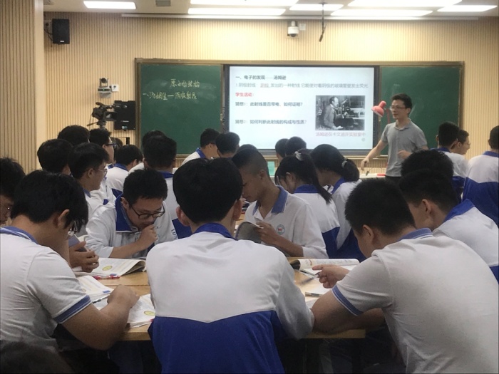 上午第四節(jié),高二年級備課組長張慶生老師在錄播室給高二(2)班學(xué)生上了一節(jié)主題為《原子結(jié)構(gòu)》的公開課。張老師通過手機(jī)投屏的方式向?qū)W生清晰地展示了陰極射線在磁場和電場中的偏轉(zhuǎn)情況,引導(dǎo)學(xué)生分析陰極射線的本質(zhì),提出原子可分的觀點(diǎn),而后引導(dǎo)學(xué)生思考原子內(nèi)部的正、負(fù)電和質(zhì)量的分布情況:由猜想模型到理論分析,由實(shí)驗(yàn)觀測到推翻猜想,由建立新的模型到合理解釋實(shí)驗(yàn)現(xiàn)象,環(huán)環(huán)相扣,嚴(yán)絲合縫,尤其是多次三維模擬動畫的展示,對推動課堂的進(jìn)程、高效達(dá)到預(yù)設(shè)目標(biāo)提供了極大的幫助。張老師對信息技術(shù)手段的嫻熟應(yīng)用,豐富了課堂教學(xué)的方式,激發(fā)了學(xué)生學(xué)習(xí)的興趣,大幅度提升了教學(xué)效率,達(dá)到極好的效果。