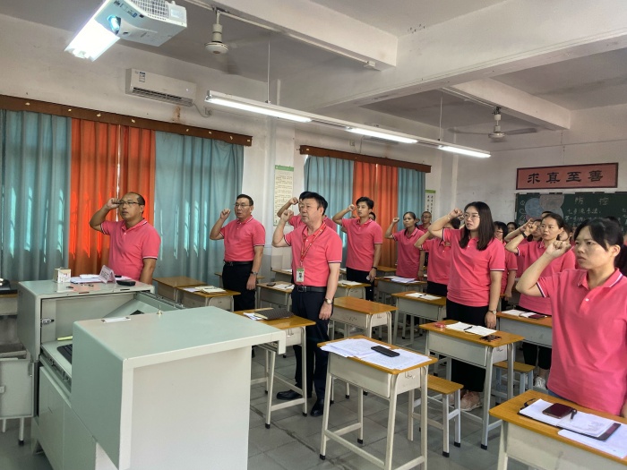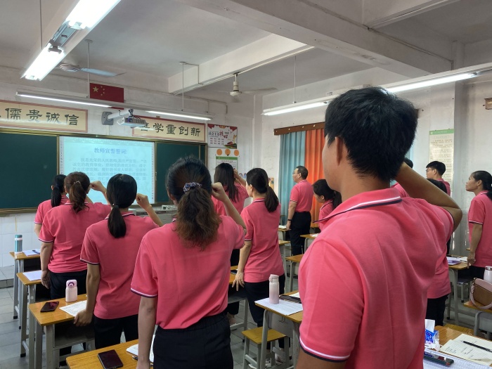 專題培訓(xùn)結(jié)束后,全體教師在政教處副主任陳七靈的帶領(lǐng)下,進(jìn)行了莊嚴(yán)宣誓:“ 我是光榮的人民教師,我莊嚴(yán)宣誓:忠誠黨的教育事業(yè),遵守教育法律法規(guī),履行教書育人職責(zé),引領(lǐng)學(xué)生健康成長,做到有理想信念、有道德情操,有扎實(shí)學(xué)識、有仁愛之心,為教育發(fā)展、國家繁榮,和民族振興努力奮斗!”會(huì)議室里莊嚴(yán)肅穆,全體教師立下鏗鏘誓言。會(huì)后,全體教師簽訂了《中山市民眾新徽學(xué)校教師師德承諾書》。