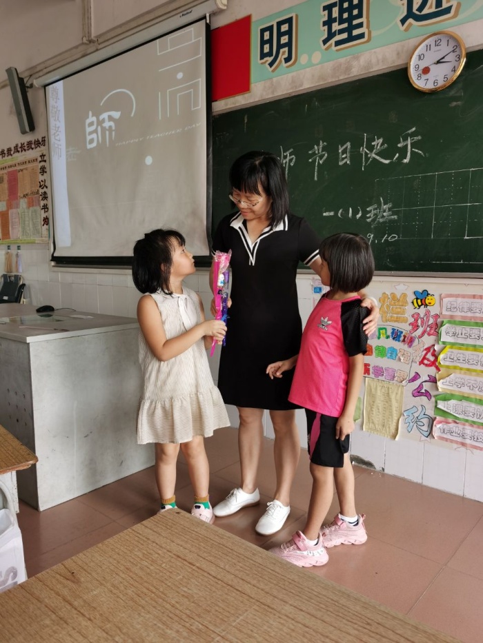 班會課上,主持人利用朗誦、歌唱、講故事、討論等多種形式來表達(dá)對老師的敬愛。首先欣賞了一首大合唱《歌聲使我們越活越年輕》,悠揚的歌聲在教室回蕩;然后由兩個小朋友進(jìn)行了詩歌朗誦《誦師恩》,他們稚嫩的童聲,凝聚成真誠的祝福,獻(xiàn)給了我們老師,同時贏得了同學(xué)們熱烈的掌聲。在班會的最后,同學(xué)們?yōu)槔蠋煫I(xiàn)上了自己的禮物……