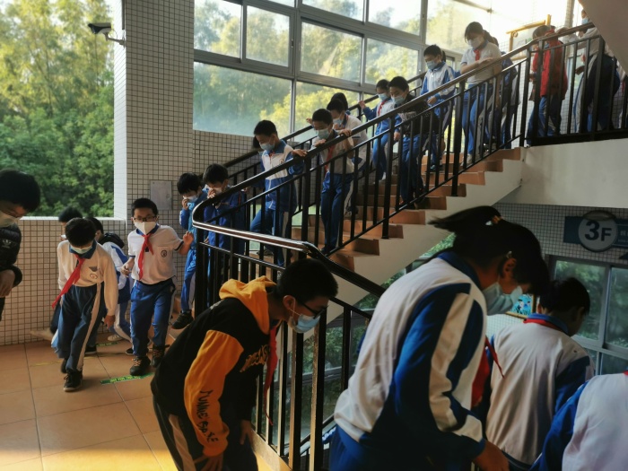演練前,學校先對學生進行了演練前的消防安全知識教育,增強了他們的消防安全意識。上午8時,隨著一陣急促的警報聲響起,學校進入緊急狀態(tài),各位班主任和應急疏散指引老師立即到達指定崗位,引導教室內(nèi)的學生快速疏散。各班學生則按照預先確定好的逃生路線迅速從教室前后門撤離。學生一個個表情嚴肅,彎著腰、捂住口鼻,沿著學校指定的疏散通道快速有序地撤離到學校操場的應急避險場所,隨即各班清點人數(shù)并上報級組長,最后級組長再向上匯報,全校所有師生安全疏散完畢,整個逃生過程迅速而有序。