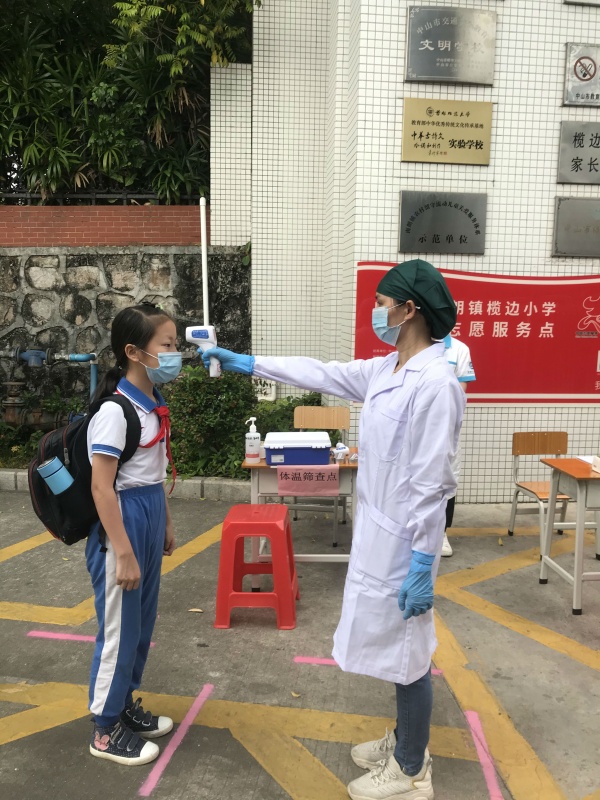 為了貫徹省、市部署,欖邊小學(xué)采用分批入校的方式避免人群密集。在校長(zhǎng)甘金鳳的統(tǒng)籌安排下,7點(diǎn)15分六年級(jí)學(xué)生入校;7點(diǎn)30分五年級(jí)學(xué)生入校;7點(diǎn)45分四年級(jí)學(xué)生入校。各部門工作人員早早在校門口體溫檢測(cè)點(diǎn),迎接學(xué)生入校。