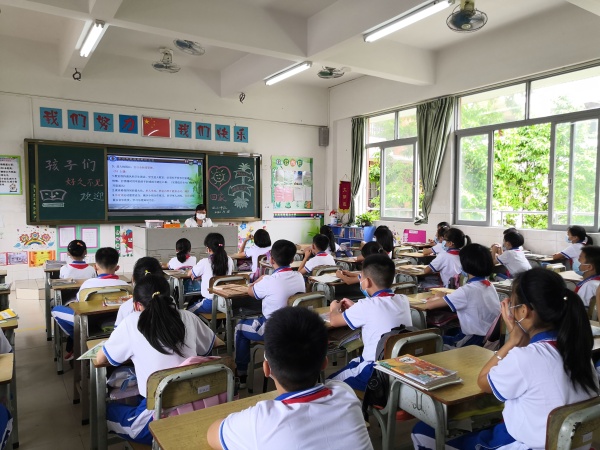 上午9:30,欖邊小學(xué)舉行了一場(chǎng)特殊的開學(xué)典禮。這是一場(chǎng)經(jīng)過(guò)了抗擊新冠疫情、度過(guò)了漫長(zhǎng)假期的開學(xué)禮,操場(chǎng)上沒(méi)有了聚集的人群,全體師生在教室里收看網(wǎng)絡(luò)直播。主持人和發(fā)言人都佩戴了口罩,這是疫情防控的顯著標(biāo)志。