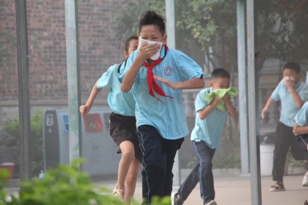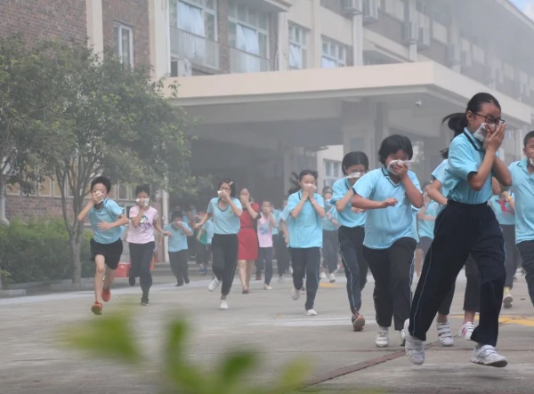 此次消防演習(xí),是在學(xué)生完全不知情的情況下舉行的,讓活動的實(shí)際效果更加明顯。8時(shí)50分,各個(gè)樓層突然濃煙滾滾,刺耳的警報(bào)聲傳來,各位老師按照預(yù)案的要求各就各位,所有學(xué)生在老師的組織下,迅速把毛巾或紙巾打濕,按照平時(shí)指定的路線彎腰前進(jìn),有序疏散到了安全的地點(diǎn)。