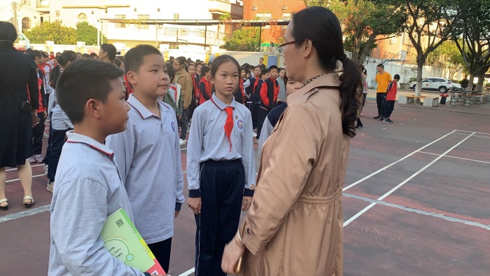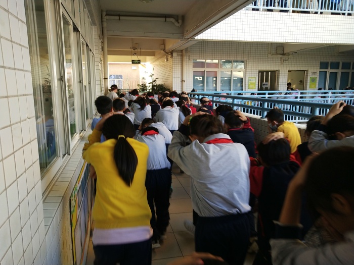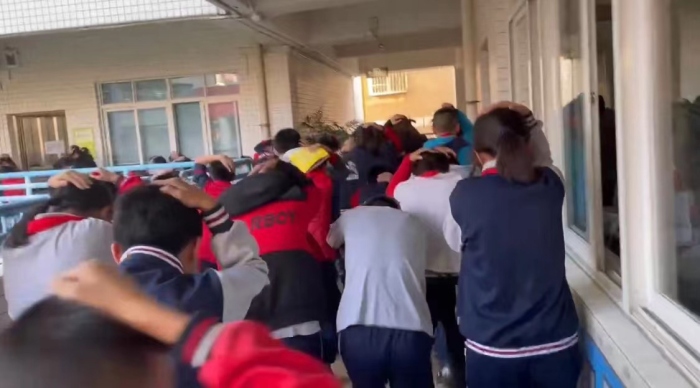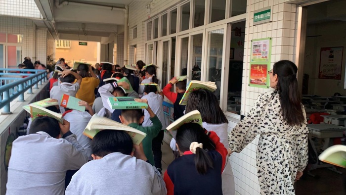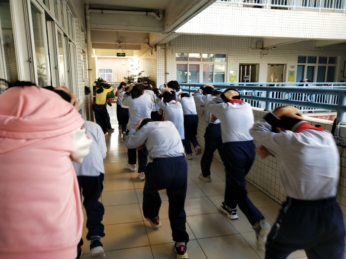下午4點25分,警報聲在將軍小學(xué)校園上空驟然響起。正在上課的師生迅速警覺并立即行動起來。各班學(xué)生在教師的指揮下,彎著腰,貓著步,用手或袖子捂住口鼻,另一手蓋著頭頂按照班級應(yīng)急演練的逃生路線安靜、快速、有序地疏散到學(xué)校指定的安全區(qū)域,全程耗時2分35秒。隨著各班班長及班主任清點人數(shù),并層層上報,全校1400余名師生全部安全疏散完畢。