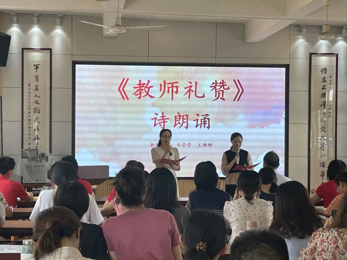 會(huì)議室里,大屏幕上“歲月染芳華 桃李育芬芳------黃提娟老師退休歡送會(huì)”幾個(gè)大字格外醒目,場面充滿了溫馨、感人的氣氛。主持人李宗強(qiáng)主任簡短介紹了黃老師的情況后,教師代表向黃老師獻(xiàn)上了鮮花,李宗強(qiáng)主任獻(xiàn)上了專為黃老師創(chuàng)作的一首詩和一副對(duì)聯(lián),韋瑩瑩、王珊珊兩位老師深情地朗誦《教師禮贊》,共同表達(dá)了對(duì)黃老師的謝意和祝福。