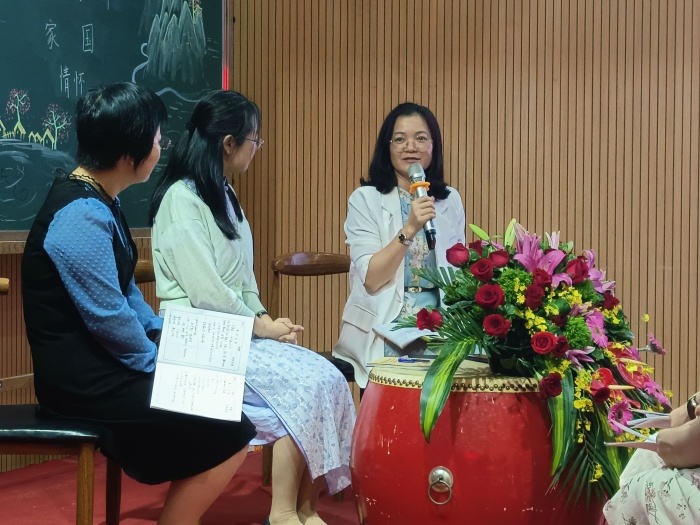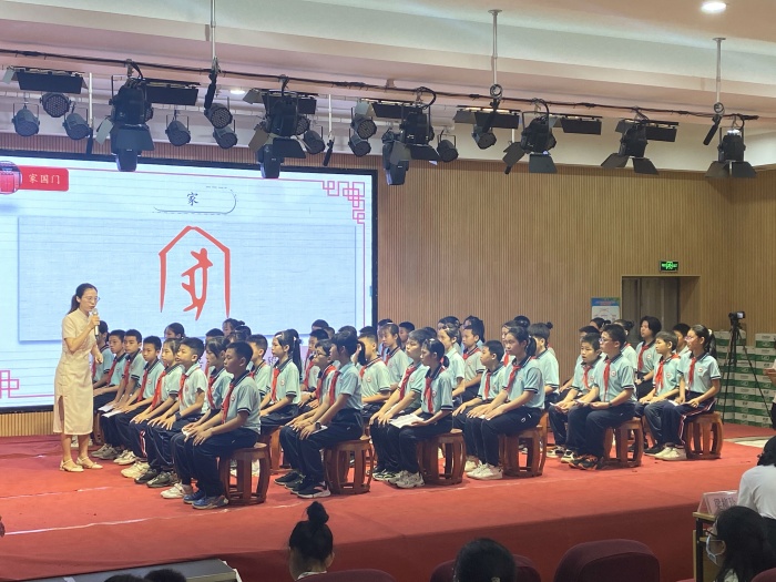 最后,民安小學梁姍姍老師進行《過零丁洋》的傳統(tǒng)文化課例展示。梁老師以家國門——神州堂——華夏室為主線出發(fā),從愛漢字、愛詩歌、愛祖國的角度帶領學生了解“家”“國”兩個漢字的由來及含義,并通過多種方式吟誦《過零丁洋》感悟詩中豐富的情感。梁老師一步步從古到今鋪墊名人愛國愛家的精神,以此激發(fā)學生身上的家國情懷。