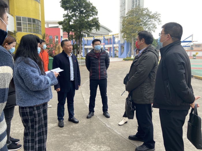 2022年2月11日上午,中山市教體局領(lǐng)導(dǎo)四級(jí)調(diào)研員黃慶財(cái)一行和南頭鎮(zhèn)教體文旅局副局長(zhǎng)洪愛(ài)華一行到南頭鎮(zhèn)中心小學(xué)進(jìn)行2022年春季開學(xué)疫情防控工作檢查,指導(dǎo)學(xué)校開學(xué)疫情防控和校園安全工作。南頭鎮(zhèn)中心小學(xué)衛(wèi)坤校長(zhǎng)、吳婷環(huán)主任、曾立主任以及防疫組成員陪同檢查。