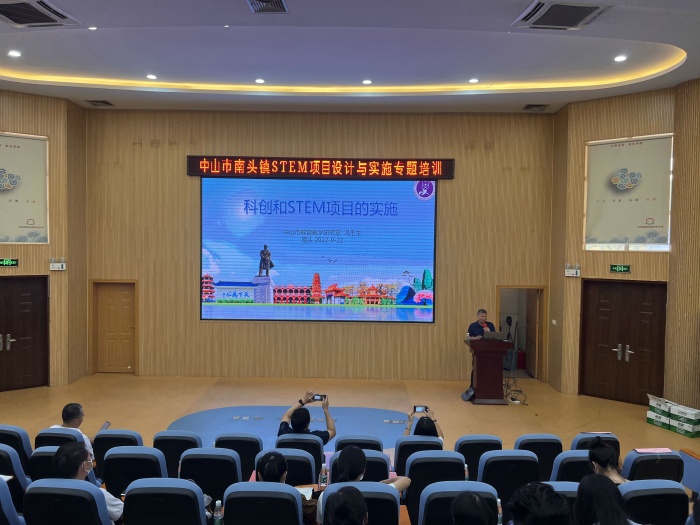 會(huì)議第三流程,是“中山市南頭鎮(zhèn)STEM項(xiàng)目設(shè)計(jì)與實(shí)施專題培訓(xùn)”。馮部長以“科創(chuàng)和STEM項(xiàng)目的實(shí)施”為主題開展了講座培訓(xùn)。講座上,馮部長以生動(dòng)有趣的例子為各位老師講述如何推進(jìn)STEM項(xiàng)目式的實(shí)施。他強(qiáng)調(diào)STEM教育是跨學(xué)科整合課程的一種方式,其課程的學(xué)習(xí)主題不同于一般的學(xué)科教學(xué)。STEM課程學(xué)習(xí)主題的教學(xué)目標(biāo)應(yīng)具有多樣性,除了學(xué)科知識(shí)和學(xué)科專項(xiàng)技能外,它還注重跨學(xué)科知識(shí)、跨學(xué)科技能的學(xué)習(xí)及跨學(xué)科思維的培養(yǎng)。在專業(yè)的引領(lǐng)下,在場(chǎng)的老師深受啟發(fā)。