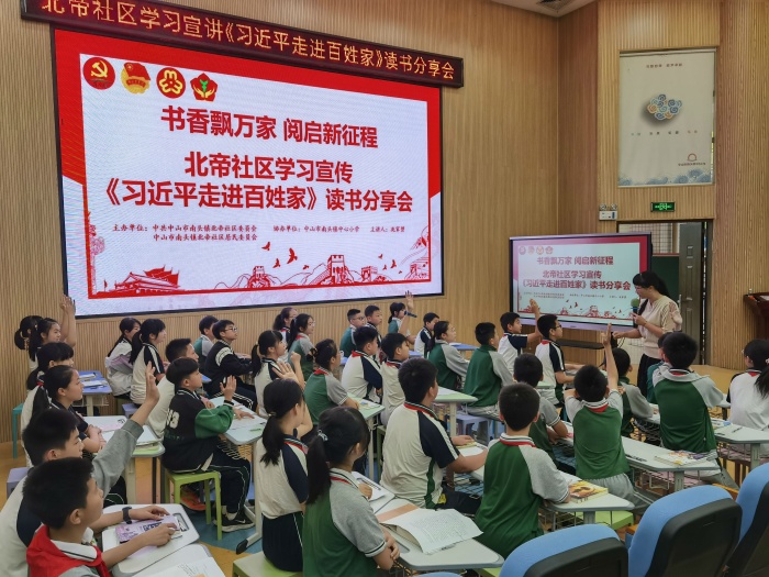 4月23日是第28個世界讀書日,由中共中山市南頭鎮(zhèn)北帝社區(qū)委員會、中山市南頭鎮(zhèn)北帝社區(qū)居民委員會主辦,南頭鎮(zhèn)中心小學(xué)承辦的“書香飄萬家 閱啟新征程”——《習(xí)近平走進百姓家》讀書分享會在學(xué)校一樓報告廳舉行,來自北帝社區(qū)黨委委員陳倩文、曾堅凡、社區(qū)工作人員出席活動,南頭鎮(zhèn)中心小學(xué)冼家碧老師執(zhí)教。