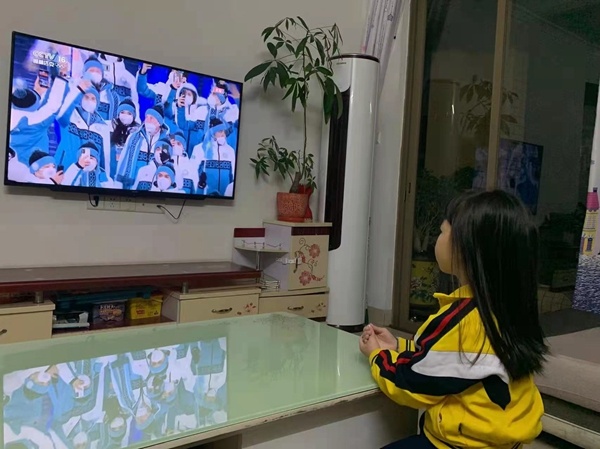 在開場節(jié)目、開場致辭、升旗儀式之后,是長達(dá)13分鐘的各國代表團運動員入場。在代表團旗幟入場環(huán)節(jié),中國體育代表團兩名旗手徐夢桃和高亭宇用一種獨特的方式揮舞著五星紅旗入場——徐夢桃坐在高亭宇的肩膀上,成為全場“最高的”旗手。鮮艷的五星紅旗高高擺動,揮灑著運動員們的汗水與激情,現(xiàn)場和屏幕前的觀眾心潮澎湃、熱淚盈眶,學(xué)生們臉上都露出喜悅的笑臉。