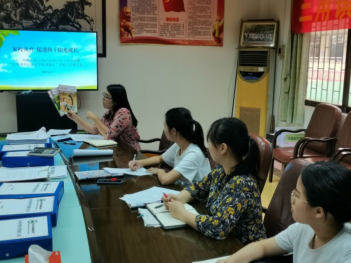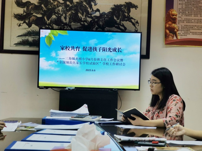 為促進(jìn)學(xué)校全國規(guī)范化家長學(xué)校試驗(yàn)區(qū)建設(shè),充分發(fā)揮班主任在家庭教育中的重要作用,三角鎮(zhèn)光明小學(xué)于6月16日召開建設(shè)全國規(guī)范化家長學(xué)校實(shí)踐活動實(shí)驗(yàn)區(qū)示范校領(lǐng)導(dǎo)小組工作會議和班主任德育研討會議。會議由德育主任林秋影主持,全體班主任參加會議。