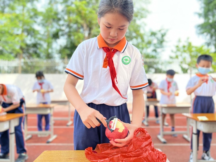系鞋帶是孩子們每天都要做的事。比賽過程中,同學(xué)們熟練地穿起了鞋帶,接著,同學(xué)們抓起鞋帶兩端,交叉、打結(jié)、綁緊,動作迅速又靈活。在一雙雙巧手的牽引下,細(xì)長的鞋帶化為了一只只美麗的蝴蝶結(jié)。四年級的同學(xué)們低著頭認(rèn)真地削著蘋果,他們一邊握著水果刨,一邊轉(zhuǎn)動著手中的蘋果,薄薄的蘋果皮一圈圈地掉下。削完后,每個同學(xué)都展示著削得干干凈凈的蘋果,咬一口,分外香甜。