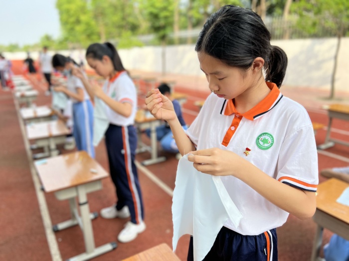 比賽一聲令下,五年級的同學(xué)們擼起袖子,彎下腰,忙碌起來……他們先將衣服浸濕,在衣領(lǐng)、袖口等特別臟的部分涂上洗衣粉,用力搓洗。揉搓,擰干,用清水漂洗……同學(xué)們訓(xùn)練有素,動作嫻熟,洗刷漂曬,一氣呵成。六年級的同學(xué)們小心翼翼地穿針引線,全神貫注地縫制著。銀針穿梭,彩線翻飛,小手輕巧地將一顆顆紐扣牢牢釘在布片上。