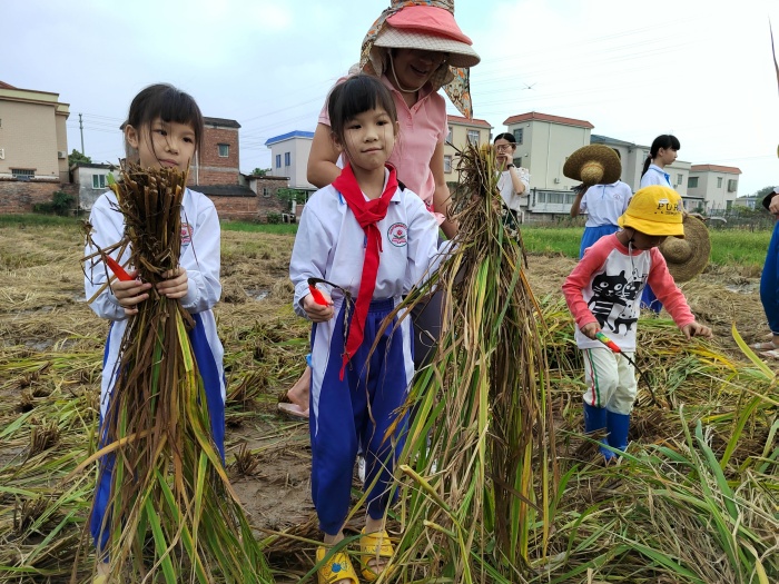 在學校德育主任林秋影等老師的帶領下,同學們興高采烈地拉著家長的手來到稻田前,秋日艷陽下,滿眼金黃的稻田讓大家驚嘆不已。在割稻開始前,稻田種植人周美坤媽媽向同學們講解了割稻的技術要點及安全注意事項,示范了如何割稻,同學們很快就掌握了握禾鐮、抓禾桿、扎禾桿的基本知識,迫不及待地嘗試割稻。稻田中,同學、家長之間互相配合,有的負責割稻,有的負責捆扎,有的負責搬運,同學們收割、搬運、拾稻穗,一點都不馬虎,剛開始的時候有的同學要花很大的力氣才割下來一株,但熱情不減,很快就掌握了技術要領,熟練起來。