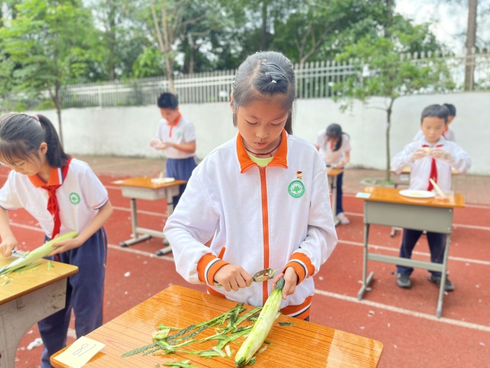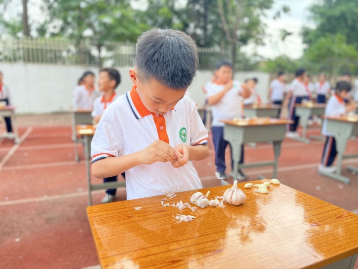 一年級進行的是剝蒜頭比賽,同學們雖然年紀小,但是剝起蒜頭來可是有模有樣。孩子們?nèi)σ愿?,快速地完成比賽任?wù),爭先恐后地舉起自己的小手示意已經(jīng)完成比賽。評委老師根據(jù)學生剝蒜頭的數(shù)量、完整度進行打分。二年級進行的是打雞蛋比賽。同學們動作迅速,手法嫻熟,打出的蛋液均勻、細膩。三年級的同學們低著頭認真地削著青瓜,他們一手握緊青瓜,一手握住削皮器,小心翼翼地削起皮來。雖然青瓜的形狀并不規(guī)則,但在同學們的手中異常乖巧,不一會兒瓜皮就被削得干干凈凈。