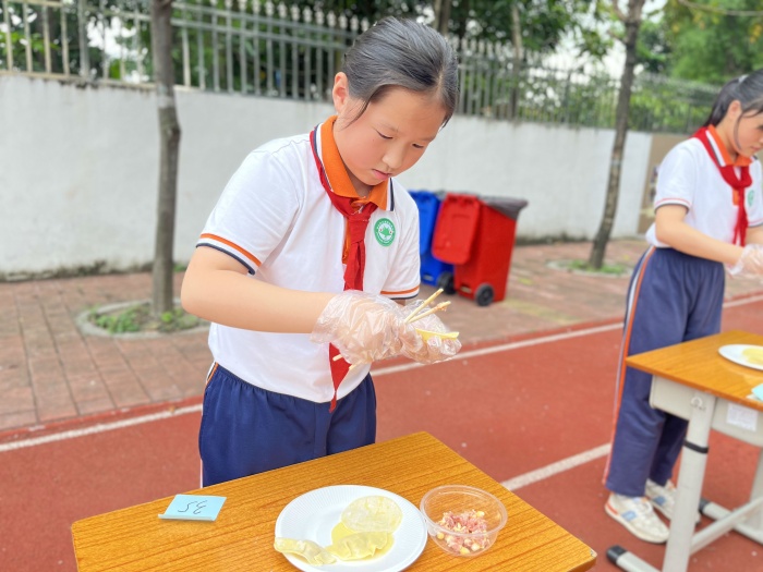 此前,各個班級通過“學習強國”平臺收集相關(guān)日常生活技能和烹飪技能的視頻讓學生回家學習,然后進行了初賽選拔。各班評選出比賽用時最短、任務(wù)完成最好、精神面貌最好的同學參加復賽。