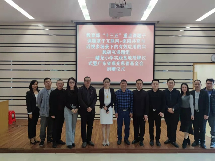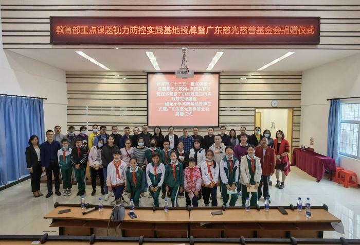 為引導(dǎo)兒童青少年積極參加愛眼護(hù)眼活動(dòng),形成愛眼護(hù)眼意識,科學(xué)保障視力健康,讓學(xué)校、家庭最終成為利于學(xué)生養(yǎng)成愛眼、護(hù)眼健康行為的環(huán)境場所,1月4日,三角鎮(zhèn)蟠龍小學(xué)在階梯室開展教育部重點(diǎn)課題視力防控實(shí)踐基地授牌暨廣東省慈光慈善基金會(huì)捐贈(zèng)儀式。出席本次的儀式的嘉賓有:廣東省慈光慈善基金會(huì)袁志會(huì)長、教育部十三五規(guī)劃重點(diǎn)課題《健康校園建設(shè)》子課題課題組組長賴玉美、視控指導(dǎo)師夏泉江老師、三角鎮(zhèn)教體文旅局副局長關(guān)浩祥、三角鎮(zhèn)教育和體育事務(wù)中心譚元茂老師以及蟠龍小學(xué)的全體行政。