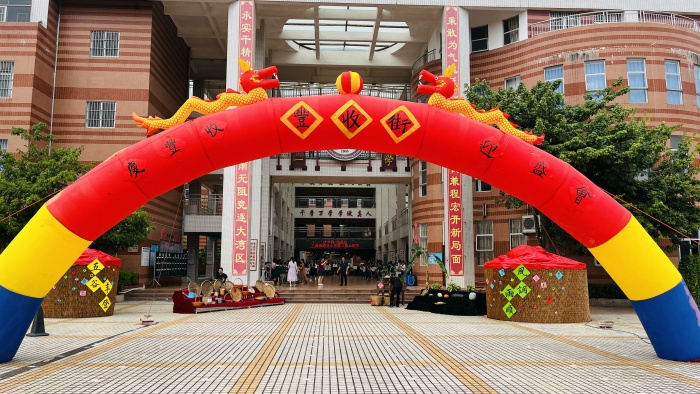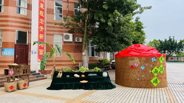 “寫”豐收,也是為了“飾”豐收。9月22日上午,為使同學(xué)們更好地感受豐收節(jié)氛圍,黃文景校長帶領(lǐng)統(tǒng)籌執(zhí)行小組提前布置場地。教學(xué)樓前,首先入目的是大大的充氣拱門——喜氣“豊收街”,慶豊收,迎盛會。左右兩邊是竹木編制搭建的豊收倉,紅色的倉頂,倉身貼著各色書法作品——“風(fēng)調(diào)雨順”“五谷豐登”——寄愿“萬谷歸倉”。其后,左邊一列農(nóng)作物工具如竹篩、簸箕、扁擔等,右邊一列大型瓜類如南瓜、冬瓜、西瓜等。再往前,一臺老式木制風(fēng)柜,古樸的機身,滄桑的顏色,出谷口處還放置了兩個竹編谷簍。階梯之上,左邊柱旁是幾只家禽——雞、鴨、鵝,右邊柱旁是各類魚——生魚、鯉魚、鯽魚、鰱魚、草魚、羅非魚、土鯪魚等。而大堂正中,便是各班精心布置的農(nóng)產(chǎn)品攤位,老式竹簸箕里裝著各色蔬菜、瓜果、豆類、菌菇,洋溢著滿滿的田園豐收氣息。