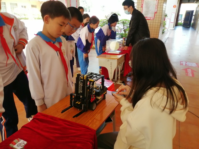 28日下午,主辦方為三角小學的全體師生帶來了精彩有趣的科普活動?;顒觿澐譃閮纱髤^(qū)域,分別是設(shè)備展示區(qū)、機器人體驗區(qū)和模擬競賽區(qū)。在設(shè)備展示區(qū),同學們可以近距離欣賞、研究部分科技機器人諸如:卡片發(fā)射機、三角龍機器人、仿生恐龍機器人等。一個個生動有趣,科技感十足的機器人吸引了不少師生駐足觀看。在現(xiàn)場工作人員的講解介紹下,不少同學互相討論,形成了熱烈的科學研究、討論氛圍。