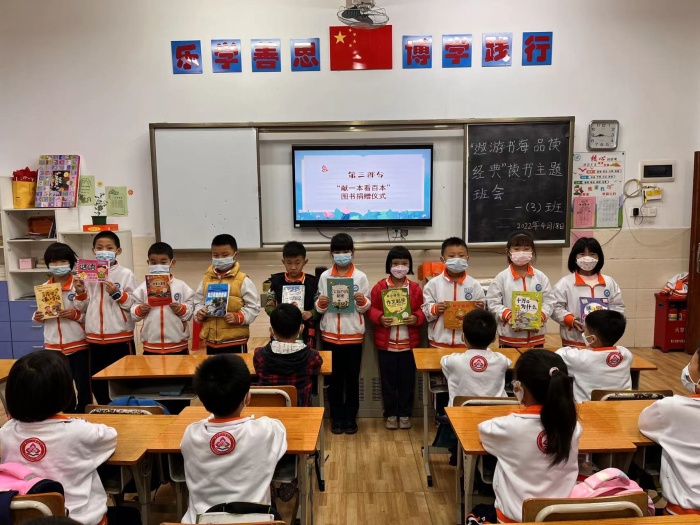 閱讀主題班會活動是以班為單位進行的。每位班主任都能圍繞學校教導處、德育處的指引,根據(jù)自班情況或孩子們的年齡特點精心設計班會內(nèi)容,一是班主任倡導多讀書、讀好書、好讀書;二是同學們暢所欲言,互薦好書,分享閱讀方法和體會,有的同學介紹近期讀的書,有的推薦喜歡的作家作品,有的介紹讀書方法,展示自己所制作的書簽、讀書筆記等。同學們聽得認真,積極互動,表現(xiàn)出了前所未有的熱情。三是“獻一本讀百本”圖書捐贈儀式,同學們把已讀過的閑置書籍分享到班級圖書角,大大豐富了班級圖書的藏量,并以此為契機,讓圖書“流”起來,讓知識“傳”起來。