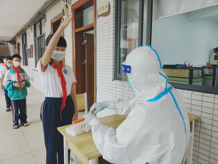 檢測工作以班級為單位,班主任提前準備好各學生的檢測葵花碼,10人為一組。孩子們排著整齊的隊伍,自覺佩戴口罩,間隔出1米以上的安全距離,在教師的帶領下,有序地進行了核酸采集信息。“請坐,頭微微后仰,請張開嘴,啊——好了?!贬t(yī)護人員一絲不茍,洗手消毒、拆棉簽,耐心地引導廣大師生完成咽喉拭子采樣,過程科學、規(guī)范。