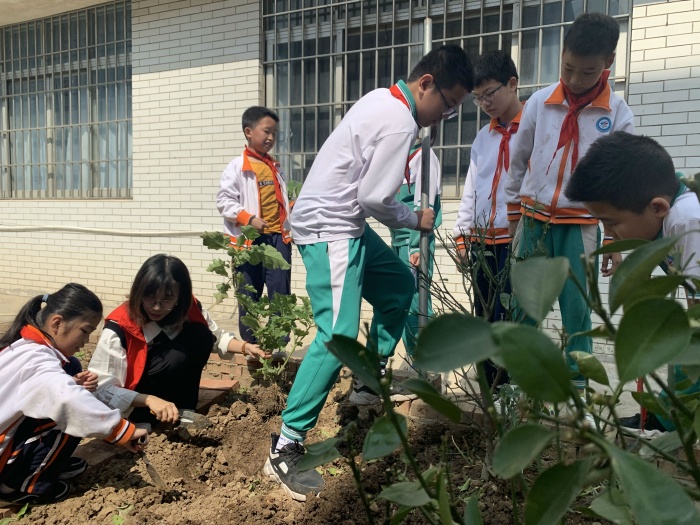 在少工委主任崔煥英的帶領(lǐng)下,隊員們來到了學(xué)校的勞動教育基地進(jìn)行勞動。隊員們有挖坑的,有扶著樹苗的,有填土的,還有提著水桶來回澆水的,打支撐的,干得熱火朝天。雖然有些是第一次參加植樹,動作稍顯笨拙,但絲毫不影響他們對植樹節(jié)勞動的積極與熱情。
