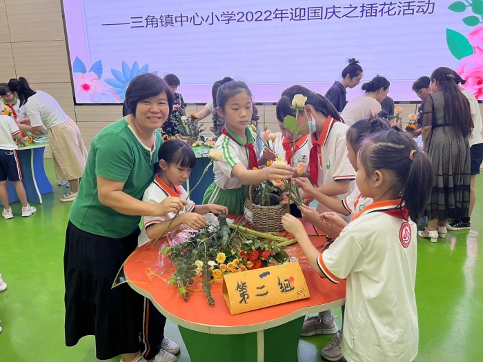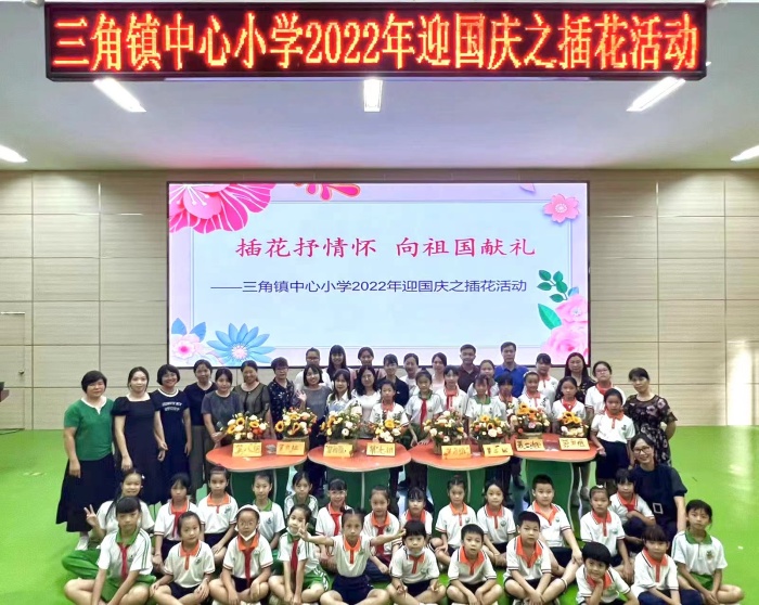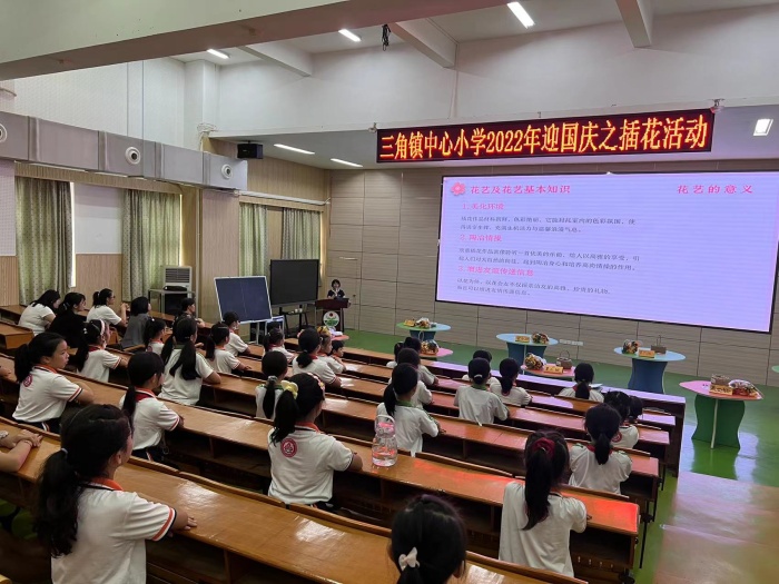 插花藝術(shù)是人們喜聞樂見的一門藝術(shù)。為慶祝新中國七十三周年華誕,迎接黨的二十大勝利召開,2022年9月29日下午,三角鎮(zhèn)中心小學(xué)在學(xué)校階梯室開展迎國慶插花活動。來自各班的36位學(xué)生、10位學(xué)校行政及16位教師代表參與本次活動,學(xué)校德育處主任陳結(jié)嫻擔(dān)任本次活動主持人。