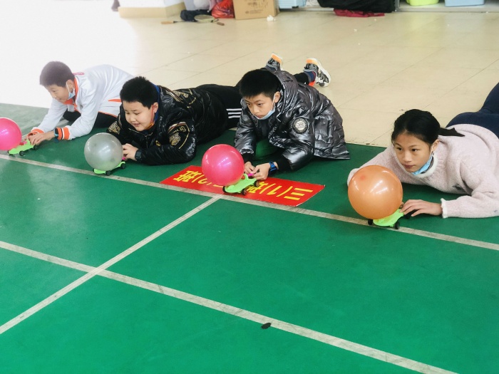 簡易的跑道前,選手小心擺放小車,小臉上盡是嚴肅的神情,不敢有一絲懈怠。比賽一開始,場地頓時安靜下來,同學們或是在屏息等候,或是在緊張地觀察其他小組的成績。男生、女生鼓著腮幫子,使勁吹,希望彩色的氣球載著他的愿望遠行。