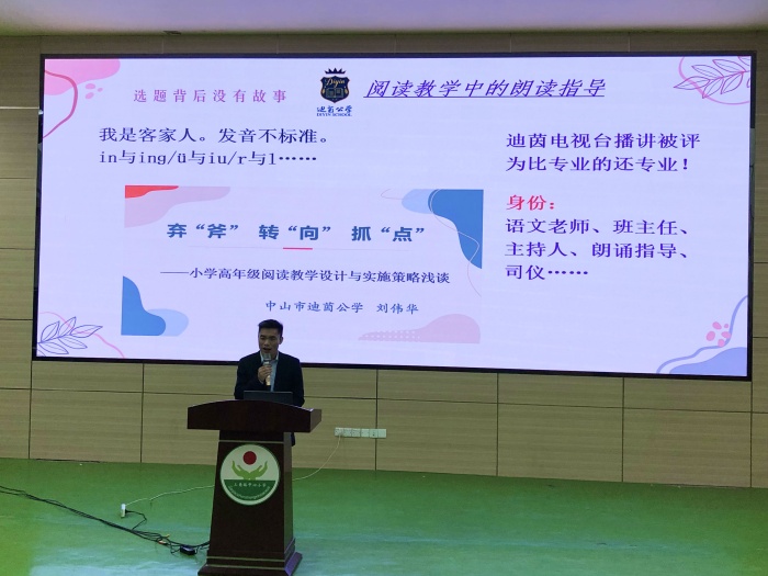 課例展示過后,迪茵公學劉偉華老師開展了題為《小學語文教師朗讀技能進階淺談》的講座。劉老師從停連的概念、作用、位置的確定、運用原則和重音使用分類等方面展開培訓,并不斷地結合實例進行現(xiàn)場朗讀示范,直觀展示了朗讀的技巧,最后還分享了語文教師朗讀學習資源,在場的各位老師收獲頗豐。