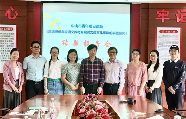 11月17日,中山市青年項(xiàng)目課題《部編版低年級(jí)語文教材開展課文改寫兒童詩的實(shí)踐研究》結(jié)題報(bào)告會(huì)在三鄉(xiāng)鎮(zhèn)白石環(huán)小學(xué)成功舉行。前中山市教研室陳春艷副主任、小欖鎮(zhèn)教研員李威老師、三鄉(xiāng)鎮(zhèn)教研員王建國(guó)老師等應(yīng)邀出席報(bào)告會(huì)并做鑒定指導(dǎo)。三鄉(xiāng)鎮(zhèn)白石環(huán)小學(xué)校長(zhǎng)劉世禮及課題組全體成員參加了報(bào)告會(huì)。