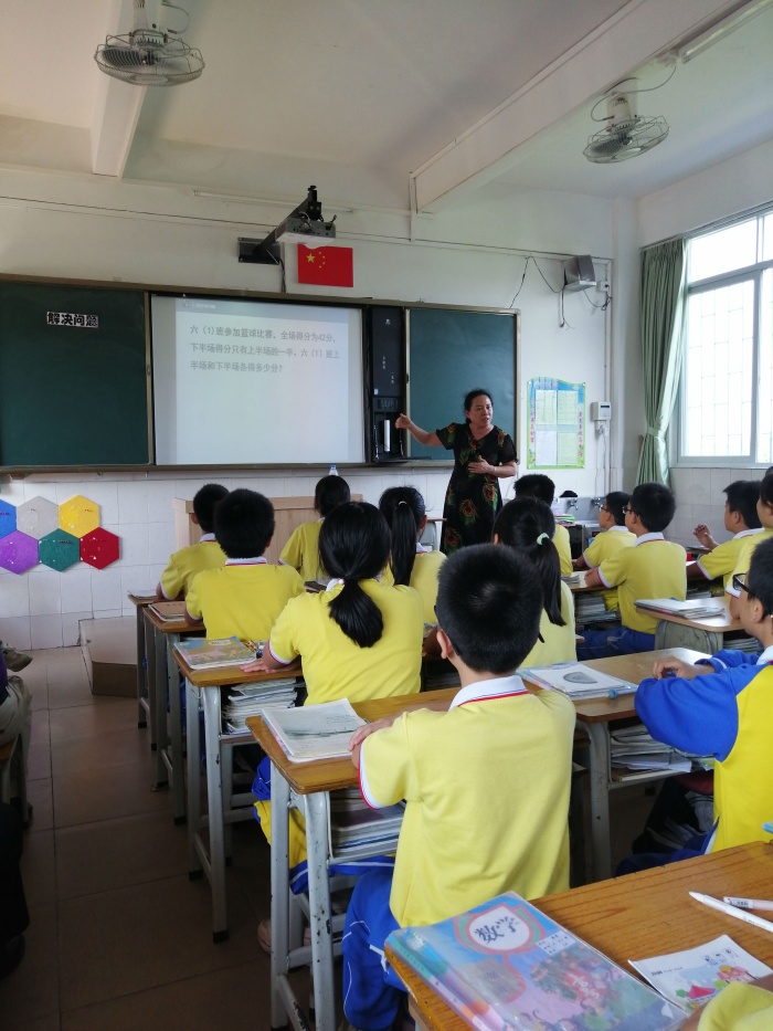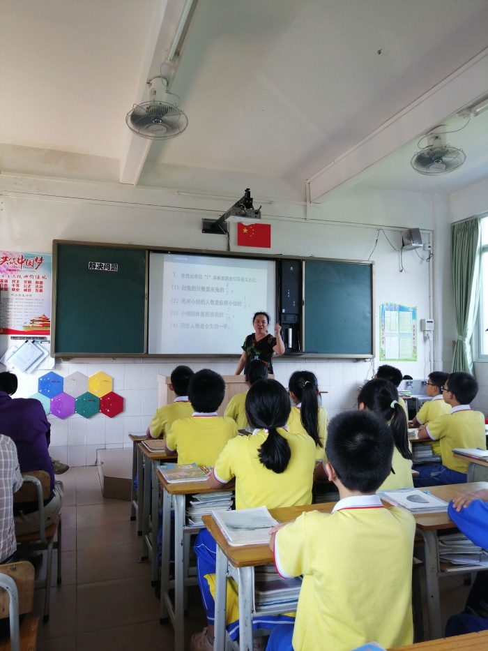 接著由吳桂珍老師給東華學(xué)校六(6)班的同學(xué)帶來了一節(jié)《解決問題》,吳老師首先帶著同學(xué)們復(fù)習(xí)了解決問題的一般過程,突出分?jǐn)?shù)解決問題的關(guān)鍵——把握單位“1”。再引導(dǎo)學(xué)生根據(jù)題目條件畫線段圖,列關(guān)系式,再列方程解答。并在學(xué)生思考交流的基礎(chǔ)上,從不同角度用多種方法解決問題,發(fā)展了學(xué)生的幾何直觀和創(chuàng)新意識。吳老師豐富的教學(xué)經(jīng)驗給聽課老師留下了深刻的印象。