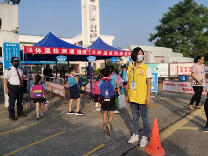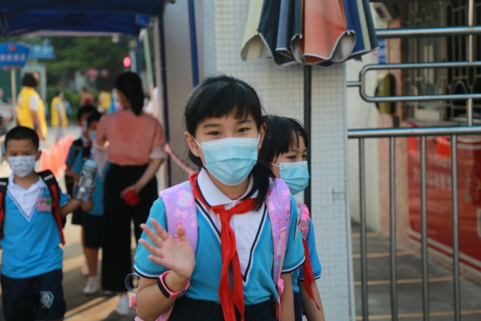 瞧,值日老師們和親子義工家長們一大早就到了校門口迎接大家,既有熟悉的面孔,也有新的載德人——有新老師,也有我們可愛的一年級的弟弟妹妹們,大家測溫后興奮有序地進入校園。
