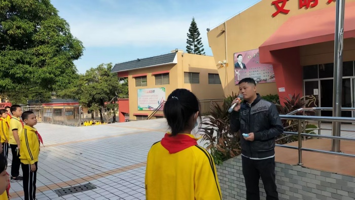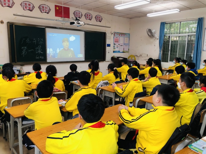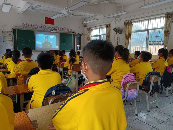 升旗儀式后,在學(xué)校德育處的統(tǒng)一安排下,全校師生觀看“廣東開(kāi)學(xué)第一課”。退役軍人吳冬生,宣講軍旅故事,他把火熱的青春獻(xiàn)給軍營(yíng),退役后發(fā)起并成立珠海市國(guó)防教育促進(jìn)會(huì),講授國(guó)防教育課500多場(chǎng),將紅色基因種在青少年的心中,老前輩的奉獻(xiàn)精神和高尚品格,令同學(xué)們肅然起敬。
