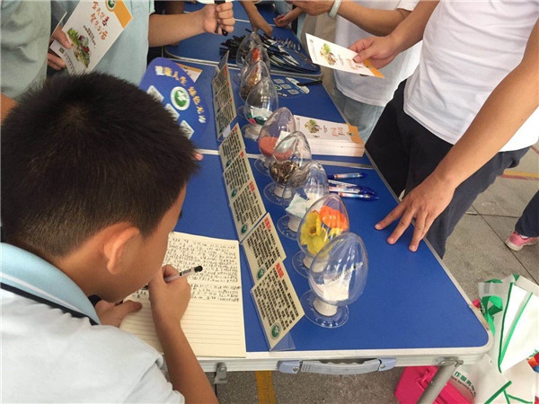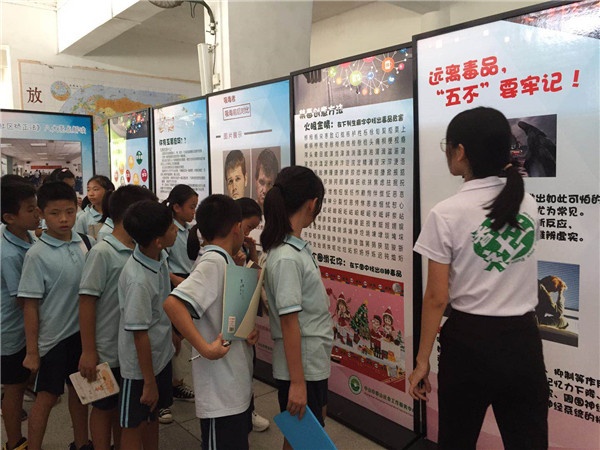 然后,學(xué)校組織各年級學(xué)生有序參觀了禁毒“集智大迷宮”。天真無邪的孩子們好奇地看著毒品的分類介紹和樣品,看著一個個因吸毒而面目全非的人,看著吸毒者因毒品而失去理性,導(dǎo)致家破人亡的景象圖片,內(nèi)心受到強(qiáng)烈的觸動?;顒蝇F(xiàn)場還設(shè)有仿真毒品展示區(qū)域,禁毒社工向同學(xué)們講解了毒品的危害,并派發(fā)禁毒宣傳小冊子,開展禁毒游戲、進(jìn)行有獎問答。同學(xué)們看著毒品模型,近距離接觸了人類社會的頭號公敵 “毒品”,不時向在場的義工提問。義工們耐心地為同學(xué)們一一作答,并為他們詳細(xì)介紹了禁毒知識,重點(diǎn)給他們講解了毒品給個人、家庭及社會帶來的嚴(yán)重危害。期間,有的同學(xué)邊參觀邊做筆記,有的同學(xué)一邊比劃吸毒人員自斷手臂的動作,一邊討論毒品的危害性。大家態(tài)度端正、認(rèn)真聽講、仔細(xì)參觀、心有所思,感到收獲滿滿,對毒品的危害性有了更加深刻的認(rèn)識。