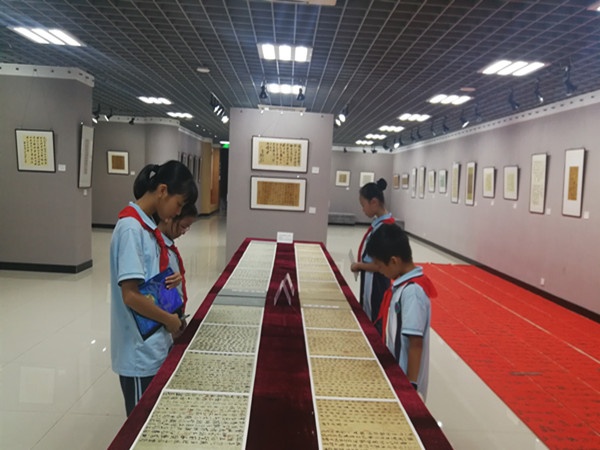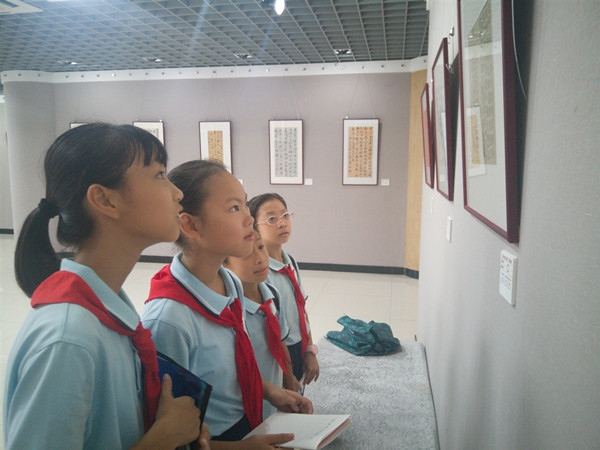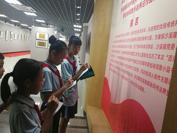 本次展覽旨在慶祝中國(guó)共產(chǎn)黨成立100周年,展示黨的百年風(fēng)華,弘揚(yáng)黨的優(yōu)良傳統(tǒng)和作風(fēng),凝聚起開(kāi)啟全面建設(shè)社會(huì)主義現(xiàn)代化國(guó)家新征程的精神力量,重振沙溪龍威和中山虎威,加快高質(zhì)量崛起貢獻(xiàn)文化力量。本次展覽共有29位詩(shī)人創(chuàng)作主題詩(shī)詞作品,44位書(shū)法家以書(shū)法的形式展現(xiàn)紅色記憶。樂(lè)群小學(xué)少先隊(duì)代表一邊欣賞作品,一邊分享自己的感受心得,同時(shí)不忘認(rèn)真做筆記。