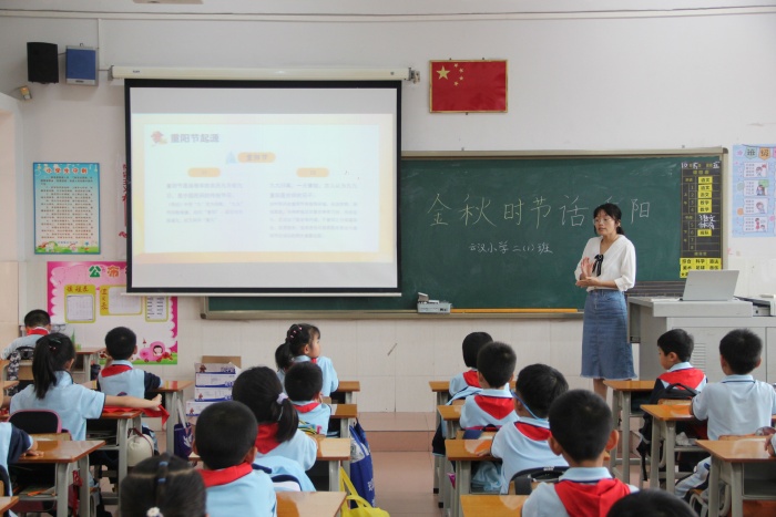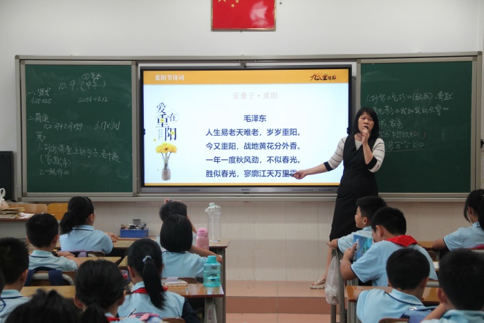 在主題班會上,老師向?qū)W生們簡單地介紹了重陽節(jié)的起源、民間習俗活動、神話故事傳說以及有關(guān)重陽節(jié)的詩詞,不僅讓學生了解到有關(guān)重陽節(jié)的知識,還讓學生懂得了“孝親敬老”的中華傳統(tǒng)美德,要做到常懷敬老之心,繼承敬老、愛老的傳統(tǒng)美德。