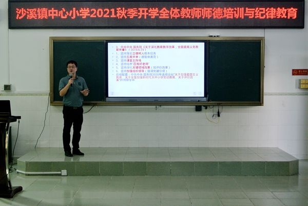 新學(xué)期,新征程,開(kāi)篇布局,科學(xué)、合理地整體規(guī)劃與安排,是沙溪鎮(zhèn)中心小學(xué)常規(guī)工作之一。為確保2021年秋季開(kāi)學(xué)工作順利進(jìn)行與“萬(wàn)無(wú)一失”,2021年8月30日上午,沙溪鎮(zhèn)中心小學(xué)在電教室進(jìn)行全體教師師德培訓(xùn)與紀(jì)律教育工作專題布置會(huì),會(huì)議由華峻校長(zhǎng)主持,分“繽紛暑假、精彩紛呈;黨建引領(lǐng)、師德先行;校園安全、責(zé)任在肩”三個(gè)部分而展開(kāi)。
