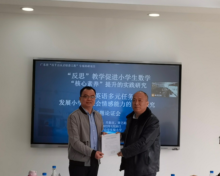 “寶劍鋒從磨礪出,梅花香自苦寒來!”2022年1月20日上午,在歲末寒冬的暖陽之下,廣東省中小學(xué)“百千萬人才培養(yǎng)工程”小學(xué)理科名教師培養(yǎng)對象、中山市實(shí)驗(yàn)小學(xué)教務(wù)處肖振漢主任主持的省專項(xiàng)科研項(xiàng)目2021年度課題《“反思”教學(xué)促進(jìn)小學(xué)生數(shù)學(xué)“核心素養(yǎng)”提升的實(shí)踐研究》,在中山市實(shí)驗(yàn)小學(xué)名師工作室隆重舉行開題報(bào)告會。