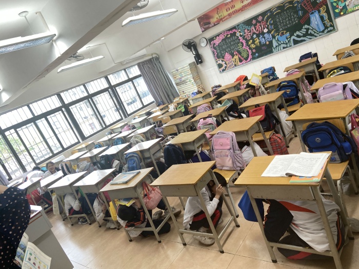 上午第一節(jié)課下課后,副總指揮潘杰主任發(fā)出突發(fā)地震演練的指令,各班老師指揮學(xué)生井然有序地進(jìn)行地震演練操作,只見(jiàn)學(xué)生們蹲下身體,迅速用書(shū)包、書(shū)本等物品頂在頭上保護(hù)頭部,并迅速躲避到墻角、桌椅下面。伴隨著緊急的警報(bào)聲響起,全體學(xué)生在老師的組織帶領(lǐng)下,用手護(hù)住自己的頭部,快速有序從教室緊急撤出,按照既定路線疏散,迅速到達(dá)指定位置集合。到達(dá)安全區(qū)域后,各班班長(zhǎng)迅速清點(diǎn)人數(shù),向現(xiàn)場(chǎng)指揮匯報(bào)學(xué)生撤離情況。整個(gè)演練過(guò)程認(rèn)真、緊張、有序、高效。