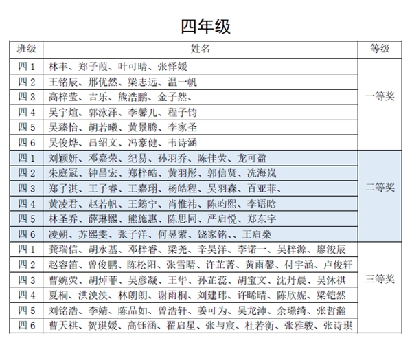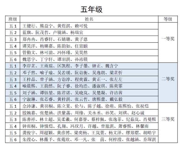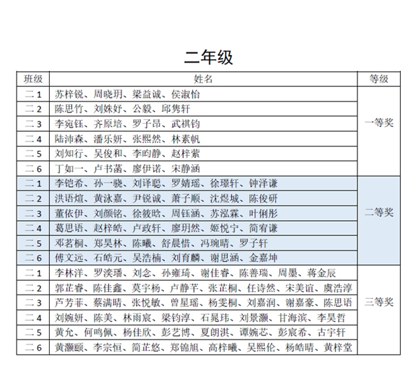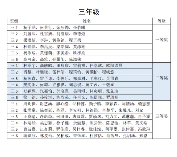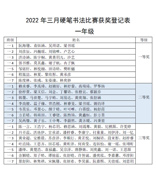 通過(guò)評(píng)委初評(píng)和交叉復(fù)評(píng),以班級(jí)為單位,每班評(píng)出一等獎(jiǎng)4幅,二等獎(jiǎng)6幅,三等獎(jiǎng)8幅。評(píng)委老師發(fā)現(xiàn)同學(xué)們的書(shū)法作品筆畫(huà)遒勁,結(jié)構(gòu)舒展,章法協(xié)調(diào),在不斷進(jìn)步中。現(xiàn)將獲獎(jiǎng)名單和部分獲獎(jiǎng)作品展示出來(lái),供大家欣賞。