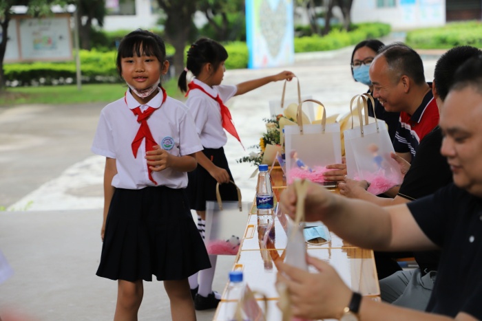 “樂善有恒,大愛無疆”,答謝儀式上,李軍委員和張穎銘局長為坦洲鎮(zhèn)工商聯(lián)(商會)、中山市大興商務(wù)酒店有限公司、中山市坦洲鎮(zhèn)一知萬大酒樓、中山市坦洲金斗酒家、中山市俠成餐飲服務(wù)有限公司、廣東合勝騰翼集團(tuán)有限公司、中山市金斗商業(yè)有限公司、中山市金斗灣文化傳媒有限公司送上感謝牌匾,感謝他們對學(xué)校教育的關(guān)心與支持。一年級的學(xué)生代表為企業(yè)家們送上了親手做的手工作品,表達(dá)孩子們感激之情。