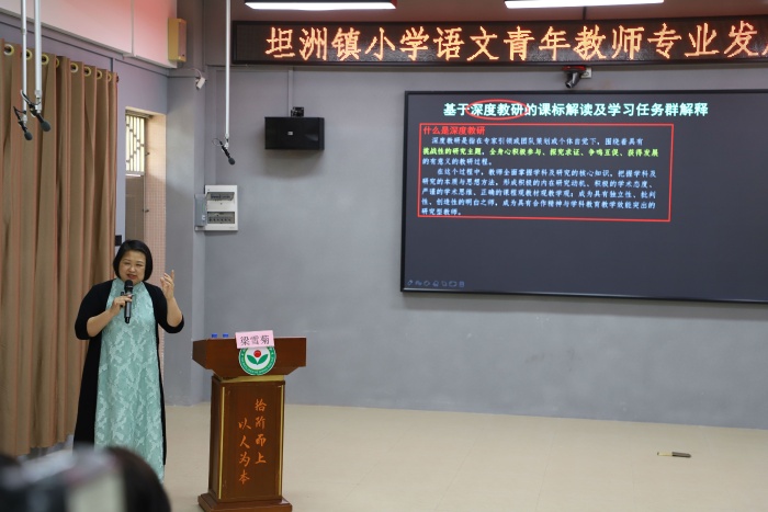 接著由梁雪菊老師開展以《基于深度教研的課標(biāo)解讀及學(xué)習(xí)任務(wù)群解釋》為主題的講座,就“精要研讀新課標(biāo),提綱攜領(lǐng),把握課程要旨?!焙汀盎緦W(xué)習(xí)任務(wù)群教學(xué)評(píng)實(shí)案,解構(gòu)教與學(xué)?!眱蓚€(gè)要點(diǎn),為老師們做出專業(yè)指導(dǎo),老師們認(rèn)真聽講,詳細(xì)記錄。她利用身邊的事例,深入淺出地為青年教師指點(diǎn)迷津,同時(shí)也肯定了李老師的專業(yè)素養(yǎng),指出本節(jié)課需要改進(jìn)之處。