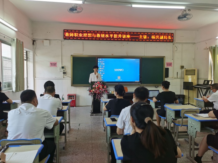 楊局長用富有哲理的理論知識、深入淺出地為大家詮釋了教師職業(yè)理想的規(guī)劃及提升教研水平的方向。要回歸教育的初心,做好自己分內(nèi)的工作,教師不僅僅是教書,更要育好人。教師要贏得尊重,就要做到三個熱愛:一是熱愛生活,用正能量的心態(tài)面對生活;二是熱愛學(xué)生,要切實落到實際行動上;三是熱愛課堂,做到認(rèn)真?zhèn)湔n,布置高質(zhì)量作業(yè),做好教學(xué)反思。楊局長從自身的心路歷程,結(jié)合自己的工作經(jīng)驗,用平實的語言講述對“教師職業(yè)理想與教研水平提升”的理解,闡述對人民教師的職責(zé)與精神的更高要求,引導(dǎo)教師堅守初心、把握方向、明確使命。