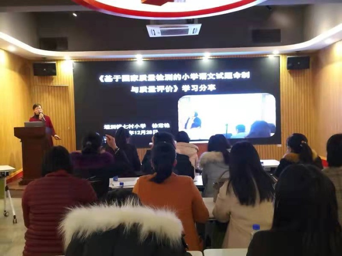 小學語文中心教研組成員、七村小學徐常艷老師則就“基于國家質量監(jiān)測的小學語文試題命制與質量評價”,從“質量檢測的情況分析”“試題命制的教學導向”兩個方面展開學習分享。徐老師通過數據分析,匯報了全市語文監(jiān)測的整體優(yōu)勢、突出亮點;通過問題歸因,探究了改進策略和推進措施。并重點就“深度學習,深度教研”提出了獨到的見解和做法,尤其強調老師要依綱靠本,在課堂上要質量。幫孩子建構知識系統(tǒng)與方法系統(tǒng),注重言語智能以及思維方法的訓練。