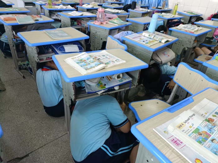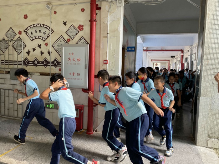 當(dāng)警報(bào)響起后,全體教師立即停止手上工作,任課教師迅速趕往各樓梯口轉(zhuǎn)彎處守護(hù)撤離學(xué)生,各班主任迅速趕到班級(jí),一、二樓隨堂科任教師組織學(xué)生有序撤離到操場(chǎng)上,三樓隨堂科任教師組織學(xué)生就地避險(xiǎn),抱頭、蜷曲、躲課桌下。50秒后,三樓隨堂科任教師組織學(xué)生有序撤離課室,到達(dá)空曠操場(chǎng)上指定的地點(diǎn)集中。學(xué)生到達(dá)指定地點(diǎn)只用了1分32秒,無一人發(fā)生跌倒摔傷事故,達(dá)到預(yù)期效果。